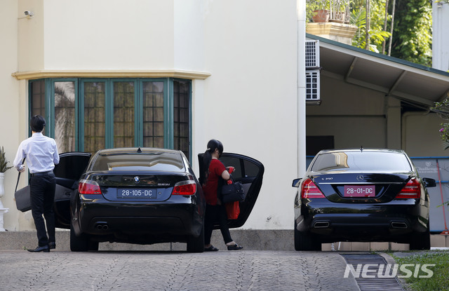 [쿠알라룸푸르=AP/뉴시스]20일(현지시간) 말레이시아 쿠알라룸푸르에 있는 북한 대사관에서 신원이 확인되지 않은 사람들이 차에서 내리고 있다. 말레이시아 정부는 19일 단교를 선언한 북한에 대해 말레이시아 주재 북한 대사관 직원들에게 48시간 안에 떠날 것을 명령했다. 앞서 북한은 말레이시아 정부가 북한 사업가 문철명 씨를 미국에 송환하기로 한 것을 비난하며 국교 단절을 선언했다. 2021.03.20.