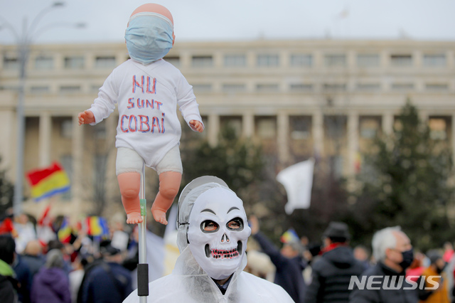 [부쿠레슈티=AP/뉴시스]20일(현지시간) 루마니아 수도 부쿠레슈티에서 코로나19 백신 반대 집회가 열려 한 시위 참가자가 "실험용 쥐가 되긴 싫다"라고 쓰인 인형을 들고 있다. 코로나19 감염이 급증하는 와중에 수백 명의 백신 반대 시위대가 거리로 나왔다. 2021.03.21.