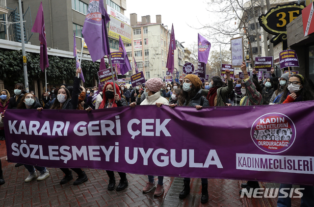 [앙카라=AP/뉴시스]20일(현지시간) 터키 앙카라에서 시위대가 "탈퇴 철회, 협약 준수"라는 현수막을 들고 레제프 타이이프 에르도안 대통령의 이스탄불협약 탈퇴 결정에 항의하고 있다. 터키는 10년 전 여성을 폭력으로부터 보호하기 위한 이스탄불협약에 서명한 최초의 국가였다. 양성평등을 선언한 이스탄불협약은 여성에 대한 젠더 폭력을 방지하고 피해자를 보호하며 가해자를 기소할 것을 의무화하고 있다. 2021.03.21