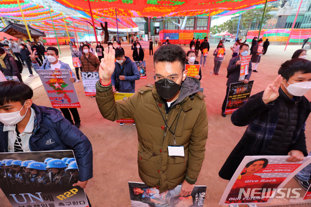 [서울=뉴시스]배훈식 기자 = 재한 아시아 미얀마 불자들이 21일 오후 서울 종로구 조계사 일주문 앞에서 열린 미얀마 민주주의 회복을 위한 기자회견에 참석해 세손가락 경례를 하고 있다. 2021.03.21. [email protected]