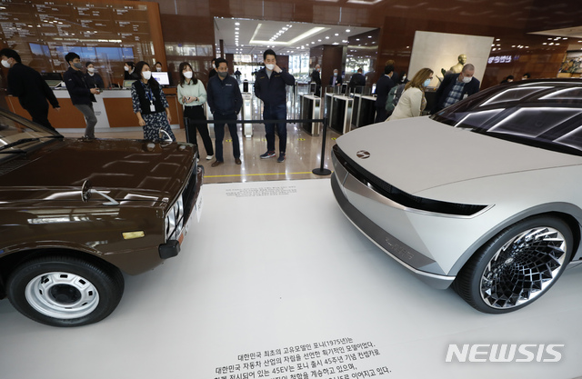 [서울=뉴시스]고승민 기자 = 22일 서울 현대건설 본사 로비에서 열린 아산 정주영 20주기 추모 사진전에서 임직원들이 함께 전시된 컨셉트 전기차 45EV와 포니 차량을 관람하고 있다. 2021.03.22. [email protected]
