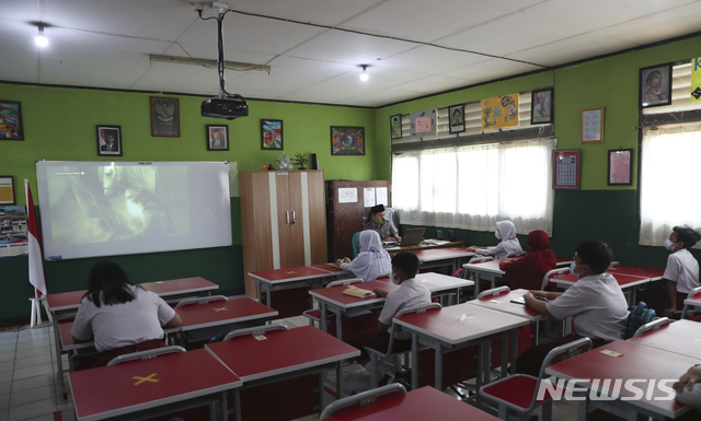 [브카시=AP/뉴시스]23일(현지시간) 인도네시아 자카르타 외곽 브카시의 한 학교 교실에 교사와 학생들이 코로나19 확산 방지를 위해 사회적 거리를 두고 앉아 있다. 2021.03.23.