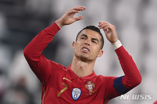 [토리노=AP/뉴시스]크리스티아누 호날두(포르투갈)가 24일(현지시간) 이탈리아 토리노의 알리안츠 스타디움에서 열린 2022 국제축구연맹(FIFA) 카타르월드컵 유럽 예선 A조 1차전 아제르바이잔과의 경기 중 득점에 실패하며 아쉬워하고 있다. 포르투갈은 아제르바이잔 골키퍼 마흐무달리예프의 선방으로 침묵했으며 아제르바이잔의 자책골로 1-0 신승했다. 2021.03.25.
