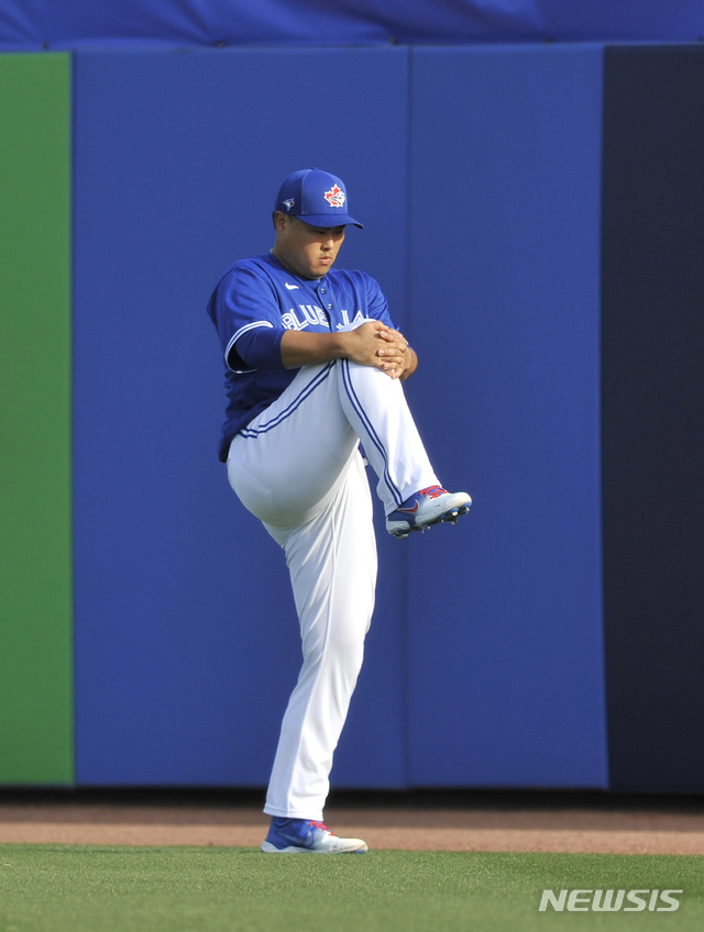 [더니든=AP/뉴시스]토론토 블루제이스 류현진이 26일(현지시간) 미 플로리다주 더니든의 TD볼파크에서 열린 필라델피아 필리스와의 시범경기 등판에 앞서 몸을 풀고 있다. 류현진은 이날 두 번 등판해 4이닝 8피안타(1홈런), 2사사구, 탈삼진 5개, 3실점(3자책점)을 기록했다. 2021.03.27.