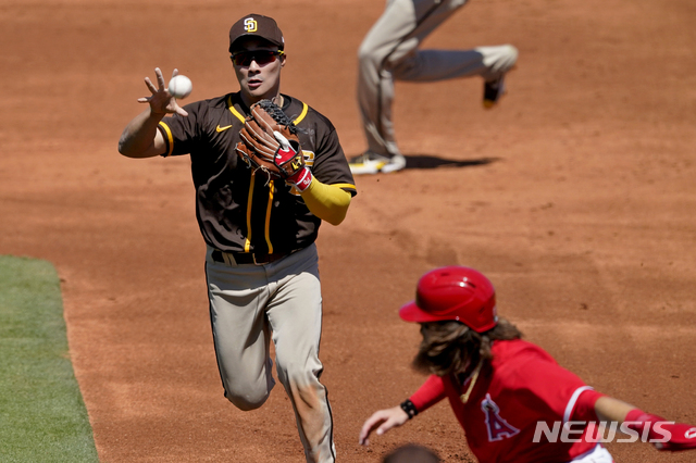 [템피=AP/뉴시스]샌디에이고 파드리스의 김하성이 27일(현지시간) 미 애리조나주 템피의 디아블로 스타디움에서 열린 LA 에인절스와의 시범경기에 선발 출장해 2회 협살 수비를 하고 있다. 김하성은 3타수 1안타를 기록해 시범경기 타율은 1할5푼(40타수 6안타)이 됐다. 2021.03.28.