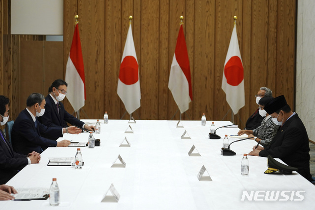 [도쿄=AP/뉴시스]스가 요시히데(왼쪽) 일본 총리가 30일 도쿄 총리공관에서 레트노 마르수디(오른쪽 가운데) 인도네시아 외무장관, 프라보워 수비안토(오른쪽) 국방장관과 회담하고 있다. 인도네시아 두 장관은 일본과의 외교·국방장관(2+2) 회의 참석차 일본을 방문했다. 2021.03.30.