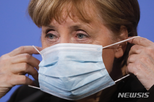 [베를린=AP/뉴시스]앙겔라 메르켈 독일 총리가 30일(현지시간) 베를린에서 연방 주지사들과의 화상 회담을 마치고 기자회견을 한 뒤 마스크를 쓰고 있다. 독일 예방접종위원회는 앞서 아스트라제네카(AZ) 백신 접종을 받은 사람들에게서 일부 혈전증 의심 사례가 발견되면서 60세 이하의 사람들에게는 AZ 백신 접종을 일시 중단한다고 밝혔다. 2021.03.31.