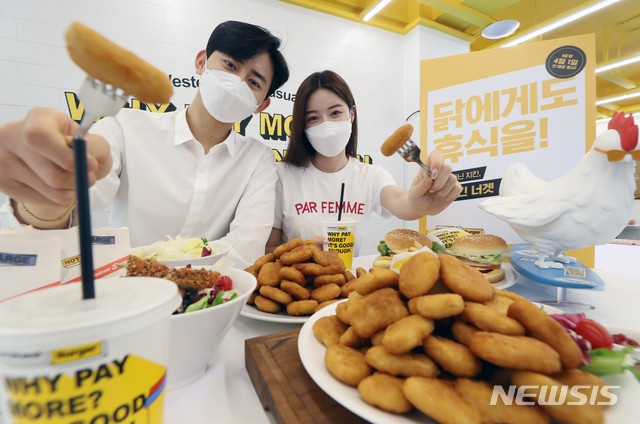 [서울=뉴시스]고승민 기자 = 31일 노브랜드버거 서울시청점에서 모델들이 닭고기 대체육으로 만든 '노치킨 너겟'을 선보이고 있다. '노치킨 너겟'은 미생물에서 추출한 단백질 '마이코프로틴'을 활용해 만든 것으로 일반적인 치킨 너겟과 맛과 식감이 비슷하다. 2021.03.31. [email protected]