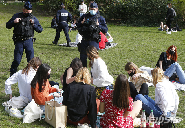 [릴=AP/뉴시스]1일(현지시간) 프랑스 북부 릴의 보방 공원에서 프랑스 경찰이 방문객들에게 코로나19 방역수칙 등에 관해 얘기하고 있다. 프랑스 의회가 3일부터 한 달 동안 이어질 세 번째 전국 봉쇄령을 승인한 가운데 장 카스텍스 총리는 코로나19 확산을 막기 위해 공원 등 공공장소에서의 음주를 금지하고 야외에서 6명 이상 모이지 못하도록 하는 등 감독을 강화하겠다고 밝혔다. 2021.04.02.