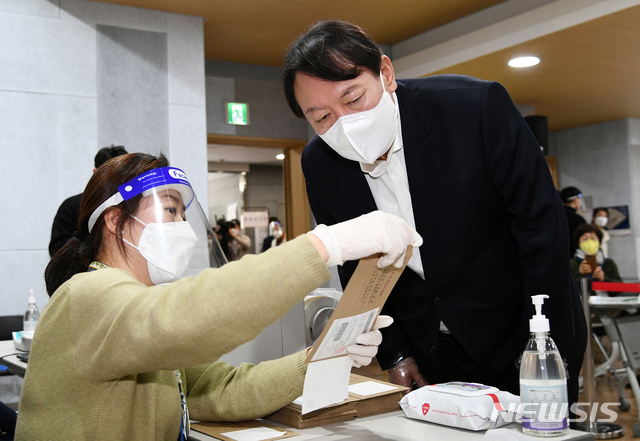 [서울=뉴시스]김병문 기자 = 윤석열 전 검찰총장이 2일 오전 서울 서대문구 남가좌1동 주민센터에 차려진 2021 재·보궐선거 사전투표소에서 투표용지 설명을 듣고 있다. (공동취재사진) 2021.04.02. [email protected]