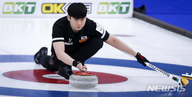 [캘거리=AP/뉴시스]한국 남자 컬링 스킵 정영석이 2일(현지시간) 캐나다 앨버타주 캘거리에서 열린 2021 세계남자컬링선수권대회 2차전 러시아와의 경기 중 샷하고 있다. 한국은 러시아에 3-9로 패하고 1차전에서 이탈리아에 1-7로 지면서 2패를 기록했다. 이 대회는 2022 베이징동계올림픽 출전을 위한 중요한 관문으로 6위 안에 들어야 진출권을 따낼 수 있다. 2021.04.03.