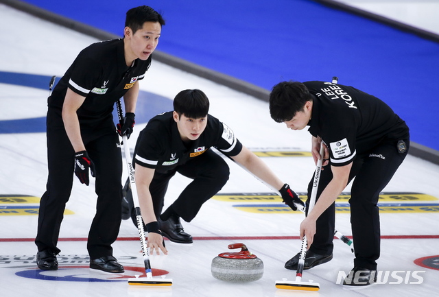 [캘거리=AP/뉴시스]한국 남자 컬링 스킵 정영석(가운데)이 세컨드 김정민(왼쪽), 리드 이준형과 함께 2일(현지시간) 캐나다 앨버타주 캘거리에서 열린 2021 세계남자컬링선수권대회 2차전 러시아와 경기하고 있다. 한국은 러시아에 3-9로 패하고 1차전에서 이탈리아에 1-7로 지면서 2패를 기록했다. 이 대회는 2022 베이징동계올림픽 출전을 위한 중요한 관문으로 6위 안에 들어야 진출권을 따낼 수 있다. 2021.04.03.