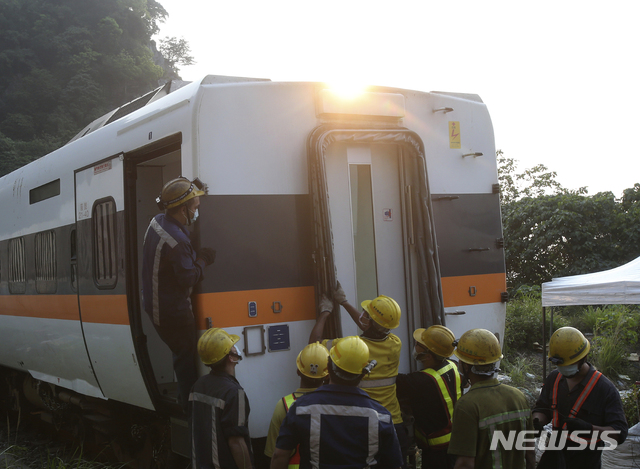 대만 열차 사고 현장 수습하는 작업자들