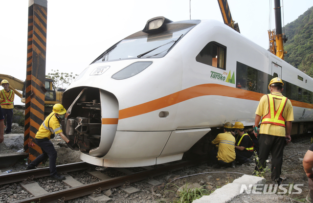 [화롄=AP/뉴시스]3일(현지시간) 대만 화롄의 터널에서 발생한 열차 충돌 및 탈선 사고 현장에서 작업자들이 대응하고 있다. 현지 당국은 2일 발생한 이 사고로 기관사를 비롯해 최소 51명이 숨지고 156명이 다쳤다고 밝혔다. 2021.04.03.