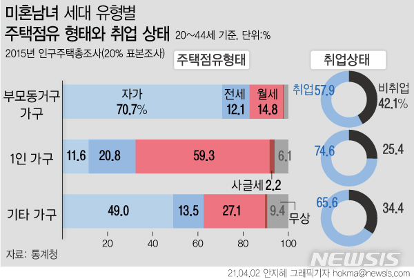 [그래픽] 미혼 30대 55% 캥거루족…1인가구 60% '월세살이'