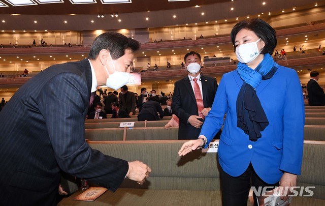 [서울=뉴시스]국회사진기자단 = 박영선 더불어민주당 서울시장 후보와 오세훈 국민의힘 서울시장 후보가 4일 서울 서초구 사랑의교회에서 열린 '2021 한국교회 부활절 연합예배'에 참석해 인사하고 있다. 2021.04.04. [email protected]