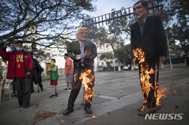 [카라카스=AP/뉴시스]4일(현지시간) 베네수엘라 카라카스 인근 엘 바예에서 부활절을 맞아 예수를 배신한 유다 화형식이 열려 도널드 트럼프 전 미국 대통령과 베네수엘라 야당 지도자 후안 과이도의 인형이 불에 타고 있다. 2021.04.05.