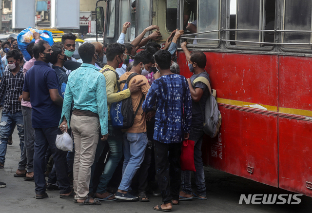 [뭄바이=AP/뉴시스]5일(현지시간) 인도 뭄바이에서 마스크를 쓴 사람들이 버스에 탑승하고 있다. 인도 당국은 대유행이 시작된 이래 코로나19 일일 감염자 수가 10만 명을 넘어 최다를 기록했다고 보고했으며 확산을 늦추기 위해 일부 사업장과 종교 시설 등을 폐쇄했다. 2021.04.05.
