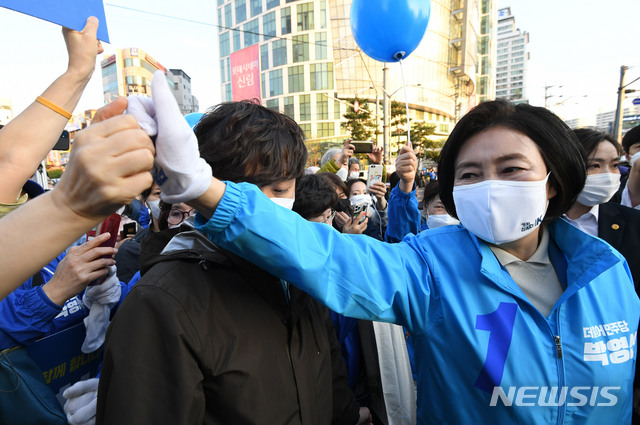 [서울=뉴시스]김진아 기자 = 박영선 더불어민주당 서울시장 후보가 5일 서울 관악구 신림사거리 유세현장에 참석하며 시민들과 인사를 나누고 있다. (공동취재사진) 2021.04.05. [email protected]