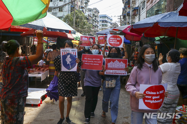 [양곤=AP/뉴시스]7일(현지시간) 미얀마 양곤에서 반 쿠데타 시위대가 "중국은 좋은 이웃이 아냐" "우리는 멈추지 않는다" 등이 쓰인 팻말을 들고 상인들의 환영을 받으며 시장을 행진하고 있다. 2021.04.07