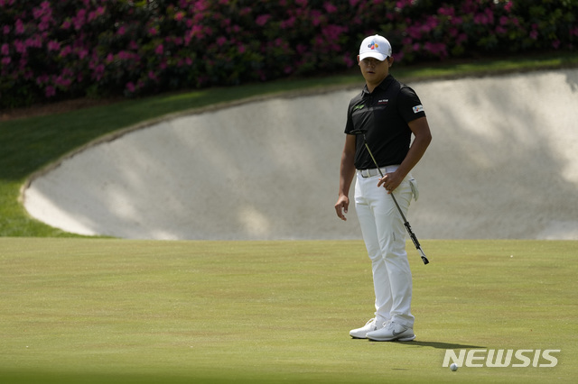 [오거스타=AP/뉴시스]김시우가 8일(현지시간) 미 조지아주 오거스타의 오거스타 내셔널 골프클럽에서 열린 제85회 마스터스 토너먼트 첫날 13번 홀에서 이글 퍼팅을 놓치고 아쉬워하고 있다. 김시우는 1언더파 공동 8위에 이름을 올렸다. 2021.04.09.