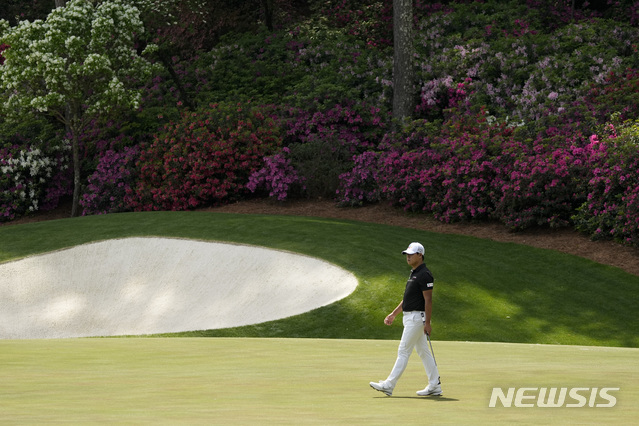 [오거스타=AP/뉴시스]김시우가 8일(현지시간) 미 조지아주 오거스타의 오거스타 내셔널 골프클럽에서 열린 제85회 마스터스 토너먼트 첫날 13번 홀에서 퍼팅 준비를 하고 있다. 김시우는 1언더파 공동 8위에 이름을 올렸다. 2021.04.09.