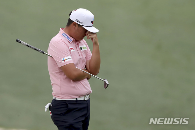 [오거스타=AP/뉴시스]임성재가 8일(현지시간) 미 조지아주 오거스타의 오거스타 내셔널 골프클럽에서 열린 제85회 마스터스 토너먼트 첫날 10번 홀에서 퍼팅을 놓친 후 아쉬워하고 있다. 임성재는 5오버파 공동 72위로 출발했다. 2021.04.09.