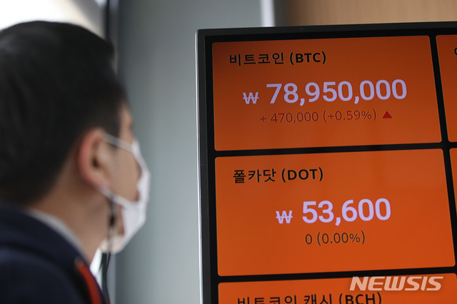 [서울=뉴시스]박주성 기자 = 비트코인이 8천만원을 돌파할지 관심이 쏠리고 있는 가운데 11일 오전 서울 빗썸 강남고객센터 전광판에 비트코인 시세가 표시돼 있다. 2021.04.11. [email protected]