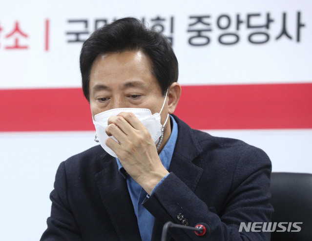 [서울=뉴시스]김진아 기자 = 오세훈 서울시장이 11일 오후 서울 여의도 당사에서 열린 국민의힘·서울시 부동산정책협의회에서 마스크를 고쳐쓰고 있다. (공동취재사진) 2021.04.11. [email protected]