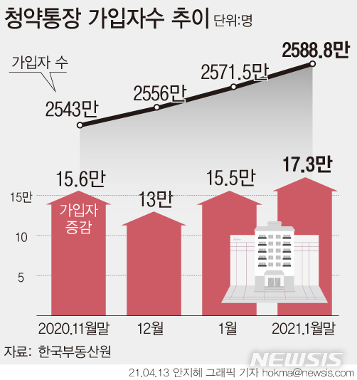 [서울=뉴시스] 13일 한국부동산원에 따르면 지난 2월 말 기준 주택청약종합저축 가입자는 2588만7777명으로 전달보다 17만3221명 늘었다. (그래픽=안지혜 기자)