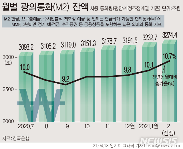 [서울=뉴시스] 13일 한국은행에 따르면 지난달 시중 통화량(평잔)은 광의통화(M2) 기준 3274조4000억원으로 전월대비 1.3% 증가했다. 1년 전과 비교하면 10.7% 늘어 2009년 3월(11.1%) 이후 6년 11개월 만에 최고 증가율을 보였다. (그래픽=안지혜 기자)