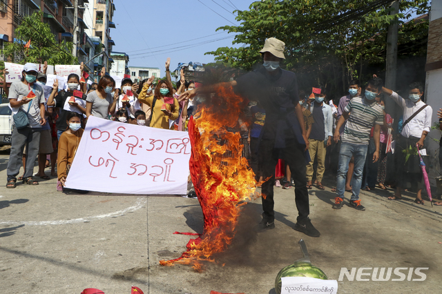 [양곤=AP/뉴시스]13일 미얀마 양곤에서 반 쿠데타 시위대가 시위 중 중국 국기를 불에 태우고 있다. 시위대는 미얀마 시장 내 일부 국내 상품의 가격에 영향을 끼친 중국과의 교역을 중단할 것을 촉구하고 있다. 2021.04.13.