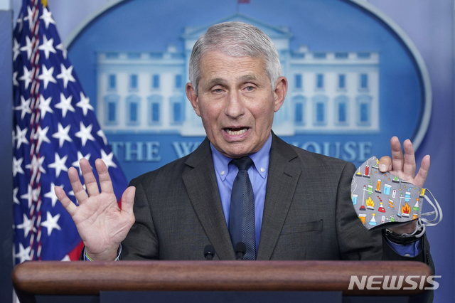 [워싱턴=AP/뉴시스]앤서니 파우치 미 국립알레르기·전염병연구소(NIAID) 소장이 13일(현지시간) 백악관에서 언론 브리핑을 하고 있다. 파우치 소장은 존슨앤드존슨(얀센)의 코로나19 백신 접종자에게서 혈전 증상이 나타나 보건당국이 이의 사용 중단을 권고한 것과 관련해 "혈전 발생 원인을 철저히 조사하기 위한 시간이 필요하기 때문"이라고 밝혔다. 2021.04.14.