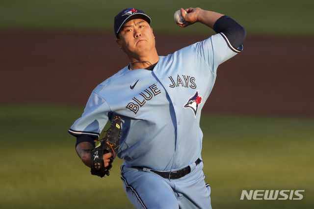 [더니든=AP/뉴시스]토론토 블루제이스의 류현진이 13일(현지시간) 미 플로리다주 더니든의 더니든 TD 볼파크에서 열린 2021 메이저리그(MLB) 뉴욕 양키스와의 경기에 선발 등판해 1회 투구하고 있다. 2021.04.14.
