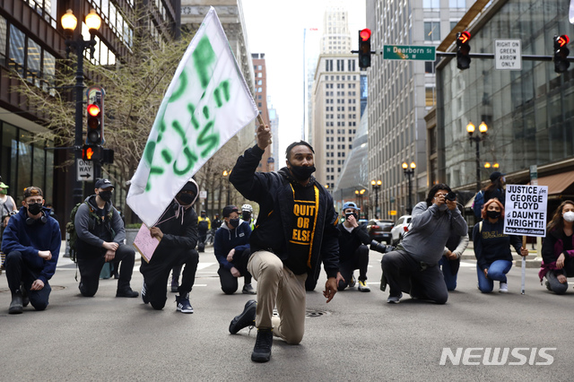 [시카고=AP/뉴시스]13일(현지시간) 미 일리노이주 시카고 도심에서 시위대가 무릎을 꿇고 지난 11일 미네소타주 브루클린센터에서 킴 포터라는 경관의 총격으로 숨진 흑인 남성 단테 라이트(20)에 대한 정의를 요구하고 있다. 2021.04.14.