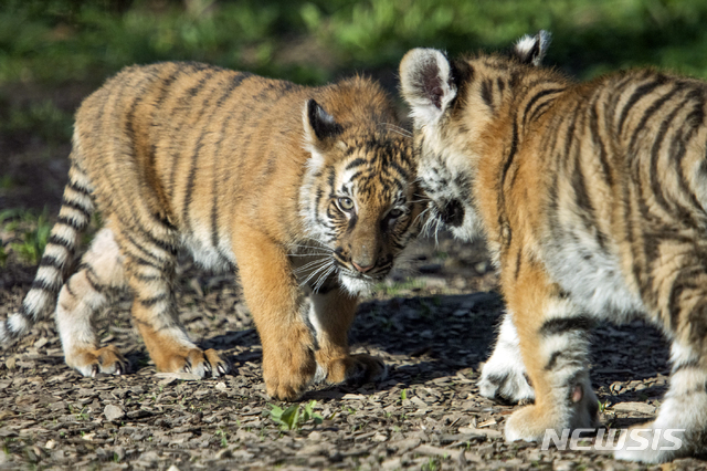 [클리블랜드=AP/뉴시스]14일(현지시간) 미 오하이오주 클리블랜드의 메트로파크 동물원이 새끼 호랑이 3마리를 대중에 공개한 가운데 그중 두 마리가 장난치며 놀고 있다. 2021.04.15.
