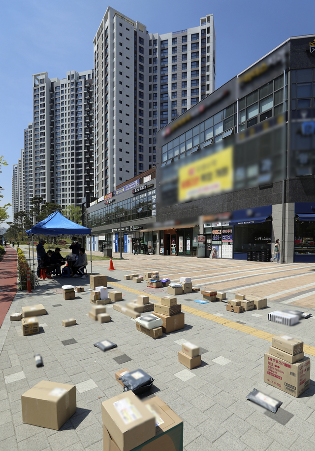 [서울=뉴시스] 최진석 기자 = 15일 오후 서울 강동구 고덕동 한 아파트 단지 앞에 지난 14일 내려진 택배 중 주민들이 찾아가지 않은 물품들이 쌓여 있다. 해당 아파트는 지난 1일부터 단지 내 지상도로로 차량이 다니지 못하도록 전면 통제 됐으며, 지하 주차장 높이가 택배 차량의 높이보다 낮게 지어져 차량 출입이 불가능하다. 2021.04.15. [email protected]