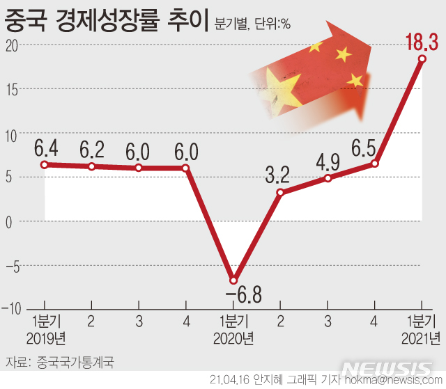 [서울=뉴시스] 16일 중국 국가통계국에 따르면 올해 1분기 중국 실질 국내총생산(GDP)이 전년 동기 대비 18.3% 증가했다. (그래픽=안지혜 기자) [email protected]