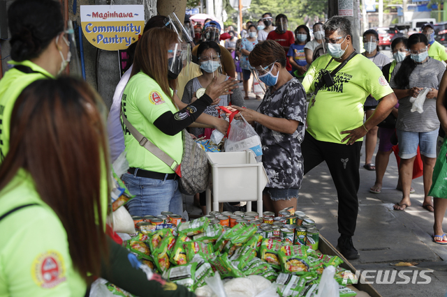[케손시티=AP/뉴시스]19일(현지시간) 필리핀 케손시티의 마긴하와에서 사람들이 '커뮤니티 팬트리'라는 무료 급식 배급소가 나눠주는 음식을 받고 있다. 정부의 코로나19 봉쇄로 많은 사람이 일자리를 잃어 주민이나 자원봉사자들이 기부한 음식이나 생필품을 이곳에서 나눠주고 있다. 2021.04.19.