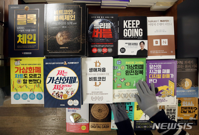 [서울=뉴시스]김병문 기자 = 미국과 한국에서 특별단속 이야기가 나오면서 비트코인 등 암호화폐의 시세가 급락한 20일 오전 서울 시내 한 대형서점에 암호화폐 서적이 진열돼 있다. 2021.04.20. [email protected]