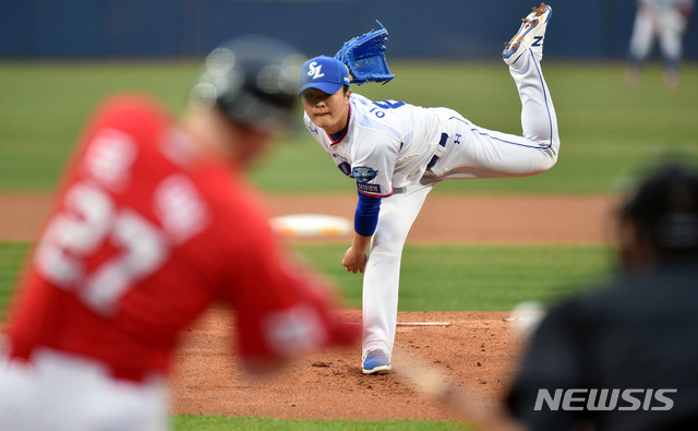 [대구=뉴시스]이무열 기자 = 20일 오후 대구 수성구 삼성라이온즈파크에서 열린 ‘2021 신한은행 SOL KBO리그’ 삼성 라이온즈와 SSG 랜더스의 경기, 1회초 삼성 선발투수 이승민이 역투하고 있다. 2021.04.20.