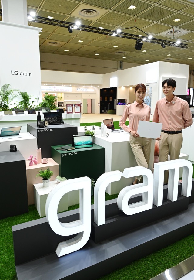[서울=뉴시스]21일 서울 삼성동 코엑스에서 열린 월드IT쇼 2021 LG전자 전시관에서 모델들이 초경량 대화면 노트북 LG 그램 2021년형 풀 라인업을 소개하고 있다. (사진=LG전자 제공) 2021.04.21. [email protected] *재판매 및 DB 금지