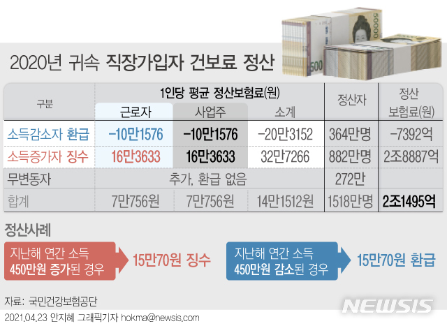 [서울=뉴시스] 지난해 보수가 오른 국민건강보험 직장가입자는 1인당 평균 16만3000원을 더 내야 한다. 반면 보수가 감소한 경우 평균 10만1000원을 돌려받는다. 국민건강보험공단은 직장가입자의 보수 변동에 따른 보험료 정산 금액을 확정해 지난 16일 사업장에 통보했다. (그래픽=안지혜 기자)