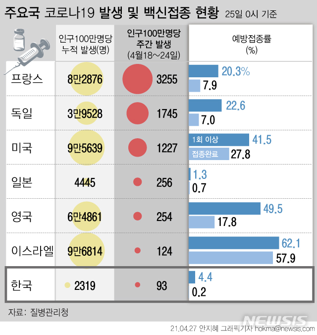 [그래픽] 주요국 코로나19 발생 및 백신접종 현황