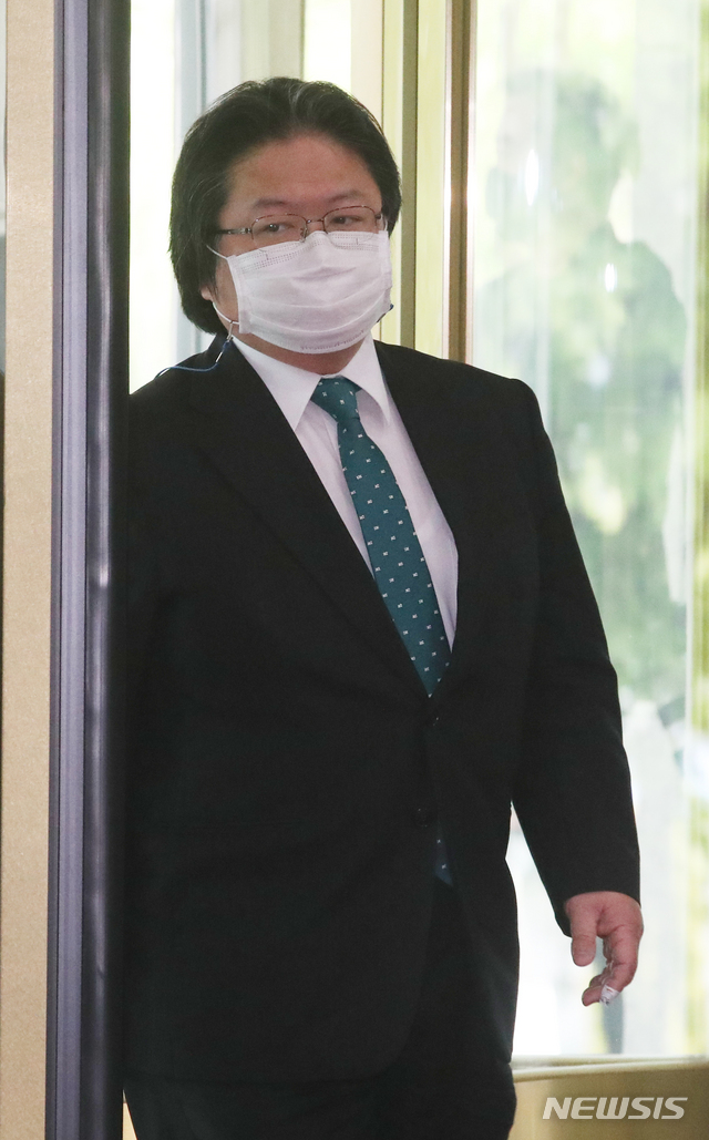 [서울=뉴시스]김명원 기자 = 일본이 외교청서에서 독도 영유권을 주장한 것과 관련해 소마 히로히사 주한 일본총괄공사가 27일 오전 서울 종로구 외교부로 초치되고 있다. 2021.04.27. [email protected]