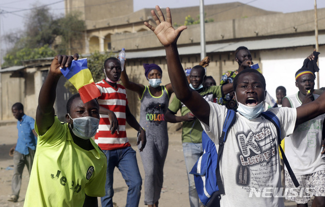 [은자메나=AP/뉴시스]27일(현지시간) 차드 수도 은자메나의 한 거리에서 시민들이 시위를 벌이고 있다. 지난주 사망한 이드리스 데비 대통령의 뒤를 이은 그의 아들 마하마트 카카 장군이 이끄는 과도 군사정부의 통치에 반대하는 수천 명이 시위를 벌였고 두 명이 목숨을 잃은 것으로 알려졌다. 2021.04.28.