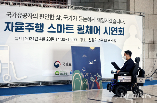 [서울=뉴시스]김병문 기자 = 2018년 평창 패럴림픽에서 아이스하키 선수로 출전해 동메달을 획득한 국가유공자(공상군경 1급) 이지훈 선수가 28일 오후 서울 용산구 전쟁기념관에서 국가보훈처 주최로 열린 '자율주행 스마트 휠체어 시연회'에서 시연을 하고 있다. 2021.04.28. [email protected]