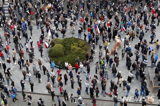 [프라하=AP/뉴시스]29일(현지시간) 체코 프라하에서 시위대가 사회적 거리 두기를 유지하려고 노력하면서 시위에 참여하고 있다. 이날 수천 명의 시위대가 지난 2014년 러시아 스파이들이 체코의 대규모 탄약고 폭발에 개입했다는 의혹에 대해 밀로시 제만 대통령이 친 러시아적 입장을 취한 것을 두고 '반역'이라고 비난하며 시위를 벌이고 있다. 2021.04.30.