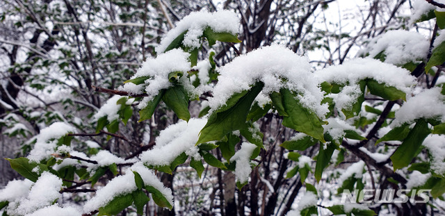 [평창=뉴시스] 김경목 기자 = 1일 오전 강원도 평창군 대관령면 해발고도 1458m 발왕산 정상에서 봄의 전령과 함께 봄눈 소식이 전해지고 있다. 이번 눈은 4월의 마지막 날(30일)부터 내리고 있다. (사진=㈜HJ 매그놀리아 용평호텔앤리조트(용평리조트) 제공) 2021.05.01. [email protected]