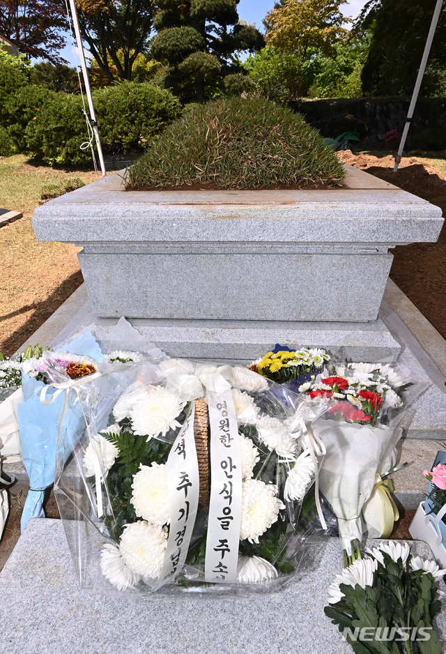 [용인=뉴시스]김종택기자 = 2일 오전 경기도 용인공원묘원 내 천주교 성직자 묘역에 안장된 고(故) 정진석 추기경의 묘소에 꽃다발이 놓여져 있다. 2021.05.02. [email protected]